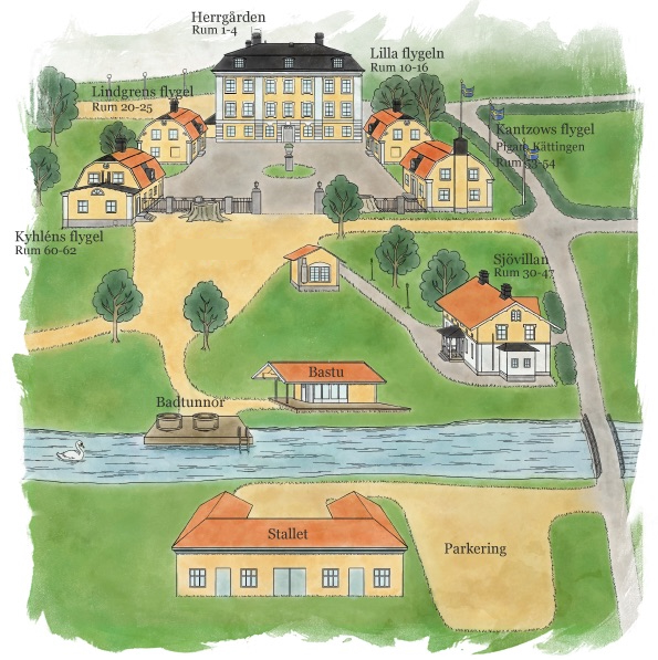 Her finner du informasjon om reisen til Schenströmska, innsjekking på herregården, overnatting, program og mer. Under ser du et kart over herregården.